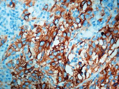Melanoma^ Clone number HMB45, This antibody reacts with a neuraminidase sensitive oligosaccharide side chain of a glycoconjugate present in immature melanosomes. It reacts with junctional and blue nevus cells. Non-melanocytic cells are negative.