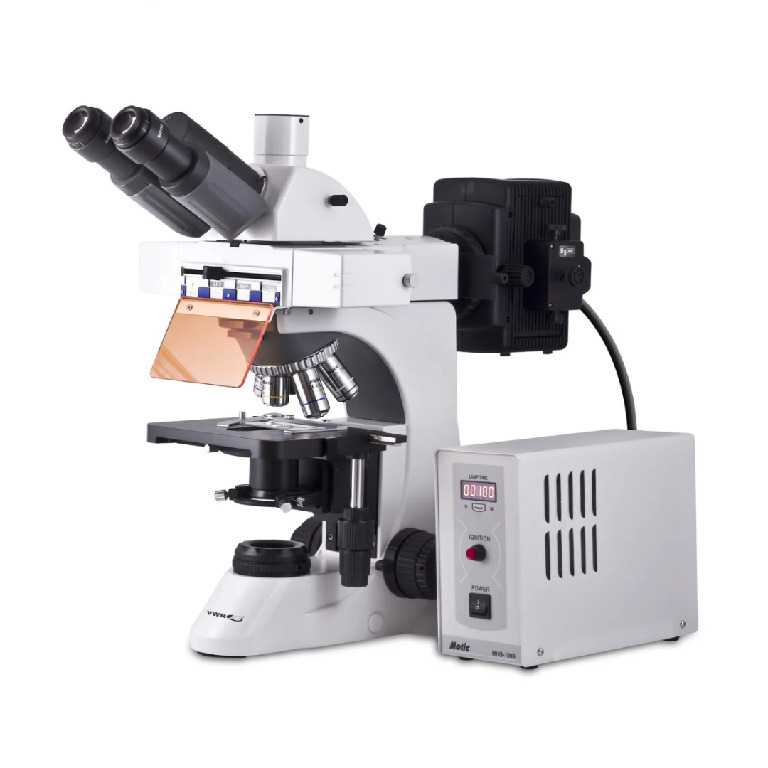 This microscope for diverse questions from life sciences, but also from material sciences., The standard EC-H plan achromat objectives can be replaced by fluorite and apochromatic lenses for maximum optical performance. Demanding users benefit from the system’s flexibility of its construction kit, ready to configure a personal microscope for individual requirements., 04_BodyText: Complete Epi-Fluorescence attachment for this microscope consists of the following individually listed parts: | Epi-Fluorescence attachment with filter cassette | Mercury Lamp 100 W | Lamphouse HBO 100 W, collector lens and mercury lamp socket | Starter unit HBO 100 W | Lamp centering tool | Power cord, 05_BodyText: Standard fluorescence filter sets: | DAPI/Hoechst/AlexaFluor 350 | Exciter D375/28× | Dichroic AT415DC | Emitter D460/50 m EGFP/FITC/Cy2/AlexaFluor 488 | Exciter AT480/30× | Dichroic AT505DC | Emitter AT535/40 m TRITC/Cy3/TagRFP/AlexaFluor 546 | Exciter AT540/25× | Dichroic AT565DC | Emitter AT605/55 m, 02_BulletPoint: Advanced compound Epi fluorescence microscope trinocular head Siedentopf type 30° inclined, 360° rotating (light split 20/80) | Widefield high eyepoint eyepieces WFPL 10×/20 mm with diopter adjustment on both eyepieces, with rubber eyecup (paired) | Reversed sextuple nosepiece | CCIS Plan Achromat objectives EC-H PL4×, EC-H PL10×, EC-H PL40× S,EC-H PL100× S-oil | Coaxial coarse and fine focusing adjustment | Built in low position rackless stage with right hand control | Achromat swing-out condenser N.A. 0.90 with iris diaphragm | Koehler illumination 3 W LED with external lamp house and intensity control | Universal power supply 100 to 240 V cUL, 11_Delivery: Includes immersion oil (5 ml), power cord, allen hexagonal key, vinyl dust cover., Advanced research trinocular microscope with EPI attachment (DAPI FITC TRITC), Cat. No.: 77676-450, This microscope for diverse questions from life sciences, but also from material sciences., The standard EC-H plan achromat objectives can be replaced by fluorite and apochromatic lenses for maximum optical performance. Demanding users benefit from the system’s flexibility of its construction kit, ready to configure a personal microscope for individual requirements., 04_BodyText: Complete Epi-Fluorescence attachment for this microscope consists of the following individually listed parts: | Epi-Fluorescence attachment with filter cassette | Mercury Lamp 100 W | Lamphouse HBO 100 W, collector lens and mercury lamp socket | Starter unit HBO 100 W | Lamp centering tool | Power cord, 05_BodyText: Standard fluorescence filter sets: | DAPI/Hoechst/AlexaFluor 350 | Exciter D375/28× | Dichroic AT415DC | Emitter D460/50 m EGFP/FITC/Cy2/AlexaFluor 488 | Exciter AT480/30× | Dichroic AT505DC | Emitter AT535/40 m TRITC/Cy3/TagRFP/AlexaFluor 546 | Exciter AT540/25× | Dichroic AT565DC | Emitter AT605/55 m, 02_BulletPoint: Advanced compound Epi fluorescence microscope trinocular head Siedentopf type 30° inclined, 360° rotating (light split 20/80) | Widefield high eyepoint eyepieces WFPL 10×/20 mm with diopter adjustment on both eyepieces, with rubber eyecup (paired) | Reversed sextuple nosepiece | CCIS Plan Achromat objectives EC-H PL4×, EC-H PL10×, EC-H PL40× S,EC-H PL100× S-oil | Coaxial coarse and fine focusing adjustment | Built in low position rackless stage with right hand control | Achromat swing-out condenser N.A. 0.90 with iris diaphragm | Koehler illumination 3 W LED with external lamp house and intensity control | Universal power supply 100 to 240 V cUL, 11_Delivery: Includes immersion oil (5 ml), power cord, allen hexagonal key, vinyl dust cover.