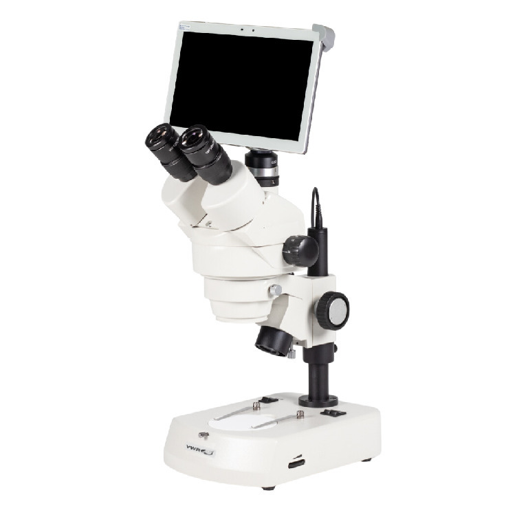 Basic stereo microscope for education work in university and high school, also suitable for transparent samples. The implemented click-stops allow precise reproduction of magnification. Students and lab technician benefit from the package solution with integrated transmitted/incident LED illumination, ready to start., Affordability and precision are beautifully combined in VWR's new stereo zoom LED microscope. This all-rounder, has been designed to be a versatile and durable optical instrument for everyday use in education, industry, and the life sciences., 04_BodyText: Photo/video: 50/50 fixed | Connection: WiFi (2.4 and 5 GHz), Ethernet | WiFi resolution: 4 MP (2592×1520 pixels) captured resolution | WiFi: WiFi output (802.1 a/b/g/n/ac supporting both hot-spot mode or using existing WiFi network) | Power supply: 100 to 240 V (cUL), 02_BulletPoint: Greenough zoom stereo microscope optical system | 45° Trinocular stereomicroscope head | Widefield eyepieces 10× / F.N. 20 | R2LED: Compact incident/transmitted illumination stand | 3 W Intensity controlled LED incident and transmitted illumination | Camera adapter 0.5× | 10" Tablet camera | 10" LCD Android tablet with 1280x800 screen resolution | Preloaded optimized app, Magnification: 0.75 - 4.5×, Basic stereo microscope for education work in university and high school, also suitable for transparent samples. The implemented click-stops allow precise reproduction of magnification. Students and lab technician benefit from the package solution with integrated transmitted/incident LED illumination, ready to start., Affordability and precision are beautifully combined in VWR's new stereo zoom LED microscope. This all-rounder, has been designed to be a versatile and durable optical instrument for everyday use in education, industry, and the life sciences., 04_BodyText: Photo/video: 50/50 fixed | Connection: WiFi (2.4 and 5 GHz), Ethernet | WiFi resolution: 4 MP (2592×1520 pixels) captured resolution | WiFi: WiFi output (802.1 a/b/g/n/ac supporting both hot-spot mode or using existing WiFi network) | Power supply: 100 to 240 V (cUL), 02_BulletPoint: Greenough zoom stereo microscope optical system | 45° Trinocular stereomicroscope head | Widefield eyepieces 10× / F.N. 20 | R2LED: Compact incident/transmitted illumination stand | 3 W Intensity controlled LED incident and transmitted illumination | Camera adapter 0.5× | 10" Tablet camera | 10" LCD Android tablet with 1280x800 screen resolution | Preloaded optimized app, Stereo zoom trinocular LED microscope with 10" tablet camera bundle, Working Distance: 100 mm, Zoom Lens: 6:1, Cat. No.: 77676-476
