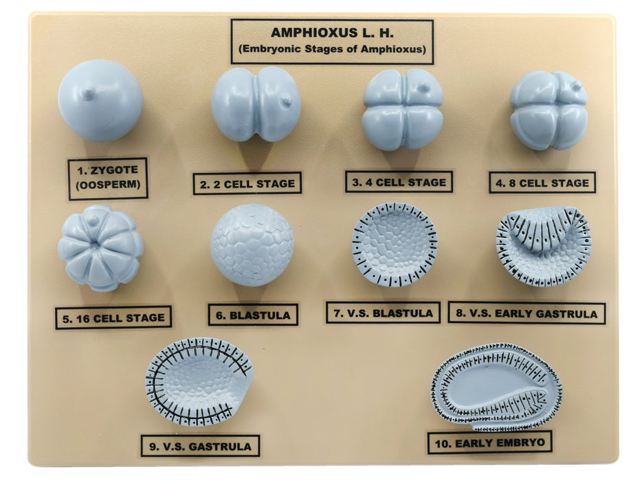 Featuring ten various models showing the development of amphoxious from initial stage to its complete development. Mounted on base. Numbered with English Key Card. The base measures 10" wide, 9" long and 1" tall. Each model measures approximately 2" tall. Stages Identified: 1. Zygote (oosperm), 2. Two cell stage, 3. Four cell stage, 4. Eight cell stage, 5. Sixteen cell stage, 6. blastula, 7. Vertical section blastula, 8. Vertical section castrula, 9. Vertical section gastrula, and 10. Early embryo. Science education products incorporate applied math and science principles into classroom and homeschool-based projects. Teachers in pre-K, elementary, and secondary classrooms use science education kits and products alongside science, technology, engineering, and math (STEM) curriculum to demonstrate STEM concepts and real-world applications through hands-on activities. Science education projects include a broad range of activities, such as practical experiments in engineering, aeronautics, robotics, energy, chemistry, physics, biology, and geology. EISCO Scientific manufactures and supplies lab equipment for education and industry. The company, founded in 1968 and headquartered in Rochester, NY, meets International Organization of Standardization (ISO) standard 9001: 2000.