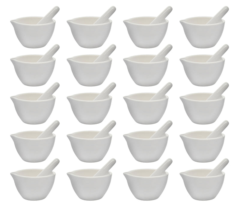 Pack of 20 Mortar and Pestle sets, each with a 2oz (60mL) capacity. Perfect for finely grinding and crushing herbs, spices, seeds & nuts, grains, pigments, powders, pills and more. Designed for use in professional laboratories, but makes an excellent addition to any kitchen. Mortar and pestle are both made of solid porcelain. Resistant to chips and cracks. Inside grinding surface of mortar and the rounded end of the pestle are unglazed for precise grinding and crushing. Mortar features a contoured spout for pouring and transferring of crushed material. Mortar measures 3.2" wide and 1.9" tall. Pestle measures 3.8" in length and the rounded end measures 1.1" in diameter.Pack of 20 mortars and 20 pestles.