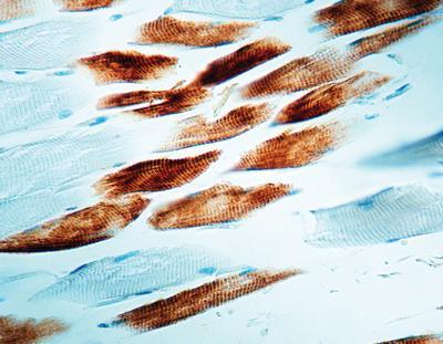 Myosin^ Clone number MY32, This antibody recognizes heavy chain of human skeletal myosin. It does not stain cardiac or smooth muscle myosin. This antibody stains the fast twitch (type II) isomyosin molecule. This antibody cross reacts with myosin from rabbit, rat, mouse, bovine, chicken and guinea pig.