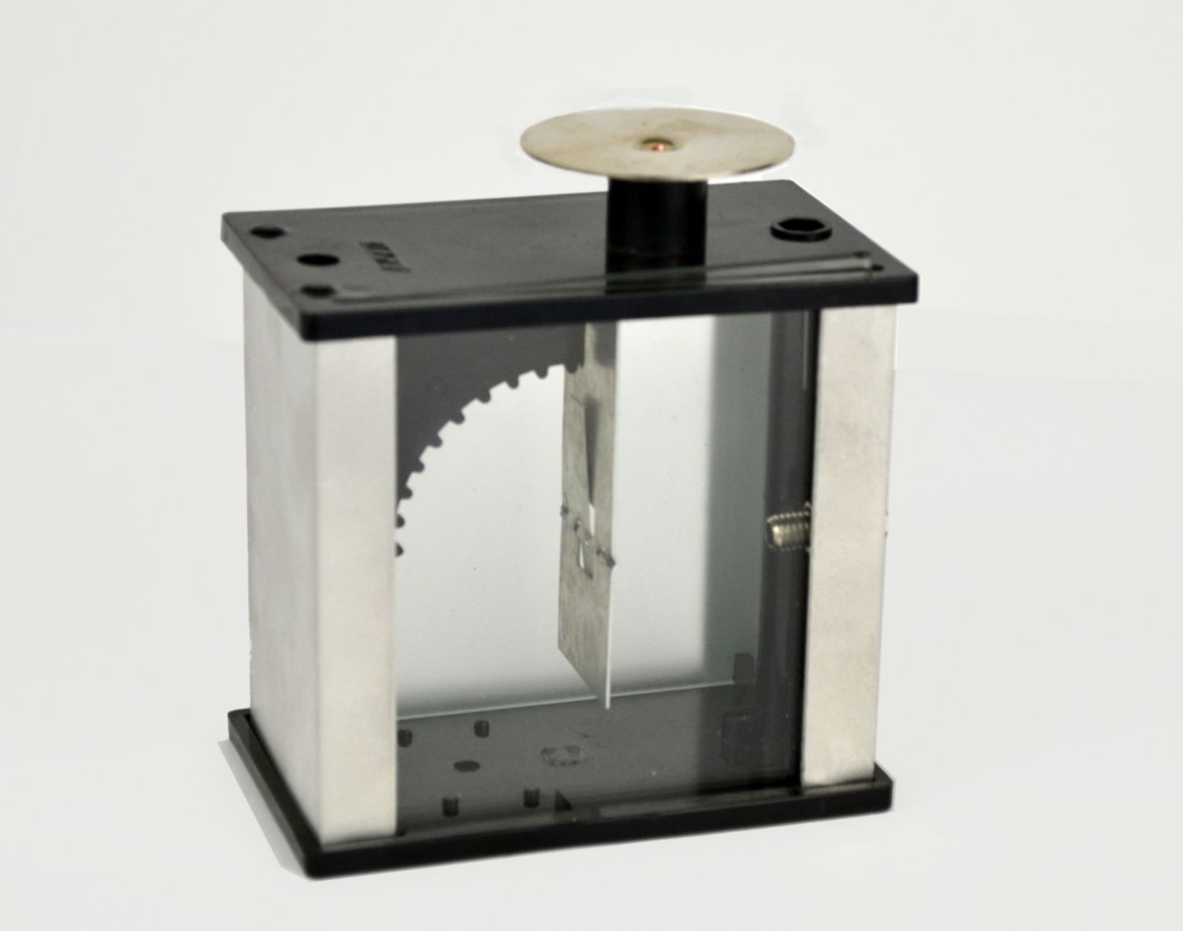 This electroscope provides hands-on experience with electrostatic principles in physics classrooms and labs. The sheet metal walls are attached to a plastic base and top. A front glass window slides up to allow insertion of ionizing material into the chamber. A lightweight metal vane serves as a pointer in the electroscope, deflecting when the plate is charged. A graduated scale is provided to measure the angle of deflection. Fitted with a 4mm socket, the assembled electroscope measures 4 x 3.75 x 2.25 inches.