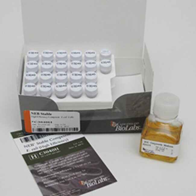 NEB Stable Competent E. coli (High Efficiency) - 20x0.05 ml. Chemically competent E. coli cells suitable for high efficiency transformation and isolation of plasmid clones containing repeat elements.