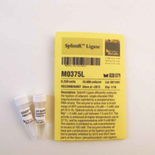 SplintR Ligase - 6,250 units. SplintR Ligase, also known as PBCV-1 DNA Ligase or Chorella virus DNA Ligase, efficiently catalyzes the ligation of adjacent, single-stranded DNA oligonucleotides splinted by a complementary RNA strand. This previously unreported activity may enable novel approaches for characterization of miRNAs and mRNAs, including SNPs. SplintR is ideally suited for many target enrichment workflows with applications in next-generation sequencing and molecular diagnostics. The robust activity of the enzyme and its affinity for RNA-splinted DNA substrates (apparent Km = 1 nM) enable sub-nanomolar detection of unique RNA species within a complex mixture, making SplintR ligase a superior choice for demanding RNA detection technologies.