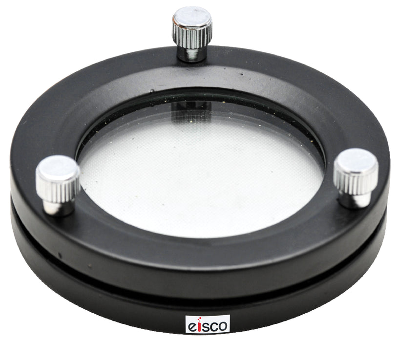 This Newton's Ring Apparatus features a sturdy 3" heavy-duty metal frame with three metal screws for pressure adjustment. The apparatus includes a pair of optically polished glass plates, each measuring 60mm in diameter, mounted together in the frame. One plate is plain, while the other is plano-convex, allowing for precise adjustments via the three metal screws that control the pressure between them.