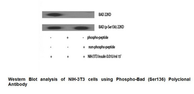 Phospho-Bad (Ser136) PAB 100ul^ Phospho-Bad (Ser136) polyclonal antibody, Host: Rabbit, Isotype: IgG, Species Reactivity: Human, Mouse, Rat, Immunogen: Synthesized peptide derived from human Bad around the phosphorylation site of S136, Synonyms: BAD; BBC6; BCL2L8, Application: WB, IHC, Size: 100ul