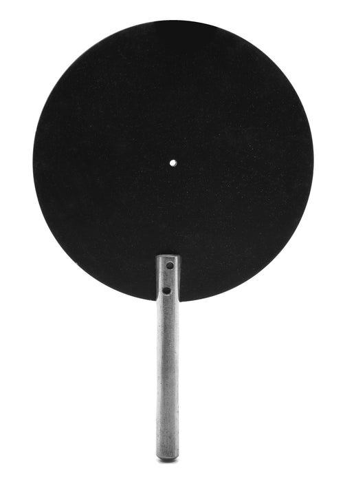 This black, circular pinhole screen measures 3 inches in diameter and is approximately 0.25 inches thick. The pinhole has a diameter of 0.06 millimeters. The total length of the screen is 4.6 inches. It is a perfect tool for physics and optics experimentation.