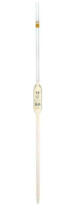 Eisco Labs 20mL Volumetric Pipette, Borosilicate glass, Class A with /-0.030 tolerance as per DIN ISO 648 standard. Calibrated for delivery. With blue graduation/markings and yellow color code for easy volume identification. Individually wrapped. Length: 20".