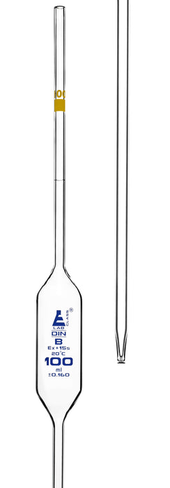 Made of high-quality, heavy-duty 3.3 borosilicate glass, this pipette meets Class B and DIN 12690 standards with a 100ml capacity and one-mark accuracy. The color code is yellow. This single, bulb-form pipette measures 23 inches tall, with an inner diameter of 5mm and an outer diameter of 9mm. The bulb diameter measures 38mm. Ideal for pipetting liquid substances from one vessel to another with accuracy, it is also autoclavable for easy sterilization. The tolerance is ±0.160ml. Eisco Labs' borosilicate glass has the following heat tolerances: strain point -515°C, annealing point 565°C, and softening point 820°C.