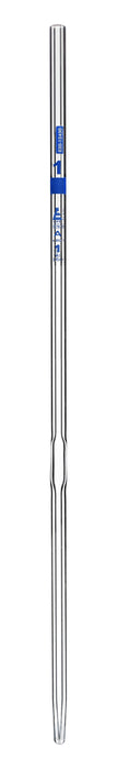 Here is the corrected text: Volumetric pipette with a 1 mL capacity, color-coded blue for easy volume identification. Eisco Labs' volumetric pipettes are made of high-quality Borosilicate 3.3 glass and feature a Class A tolerance of ±0.007 mL, conforming to the DIN ISO 648 standard. The pipette is calibrated for delivery and has a single white graduation line with blue specifications for optimal clarity against clear liquids. Measuring 12.5 inches in length and 7 mm in diameter, this autoclavable pipette offers superior chemical durability and can withstand high temperatures and thermal shocks due to its low temperature gradient. Eisco Labs' Borosilicate glass has the following heat tolerances: strain point, 515°C; annealing point, 565°C; and softening point, 820°C.