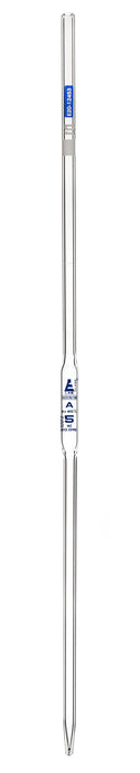 Volumetric pipette with a 5-milliliter capacity, color-coded white for easy volume identification. Eisco Labs volumetric pipettes are made of high-quality Borosilicate 3.3 glass and feature a Class A tolerance of ±0.015 milliliters, as per the DIN ISO 648 standard. The pipette is calibrated for delivery and has a single, white graduation line and blue specifications for optimal clarity against clear liquids. It measures 13.25 inches in length, with a body diameter of 6 millimeters and a bulb diameter of 12 millimeters. Autoclavable and offering superior chemical durability, this pipette can withstand high temperatures and thermal shocks due to its low temperature gradient. Eisco Labs Borosilicate glass has the following heat tolerances: strain point, 515°C; annealing point, 565°C; and softening point, 820°C.