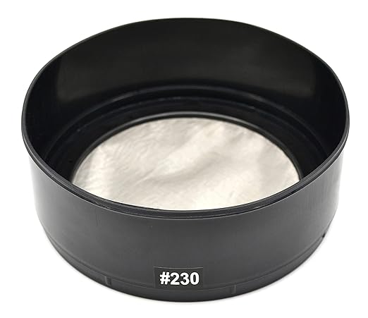 Sieve made from stainless steel mesh a black plastic frame. Mesh size number: 230. Mesh size is labeled on the frame for easy identification. 0.063mm openings in the woven stainless steel mesh. Measures 2.5" tall, 6.75" total diameter, and 5" mesh diameter. Stackable with other Eisco plastic sieves with the same dimensio