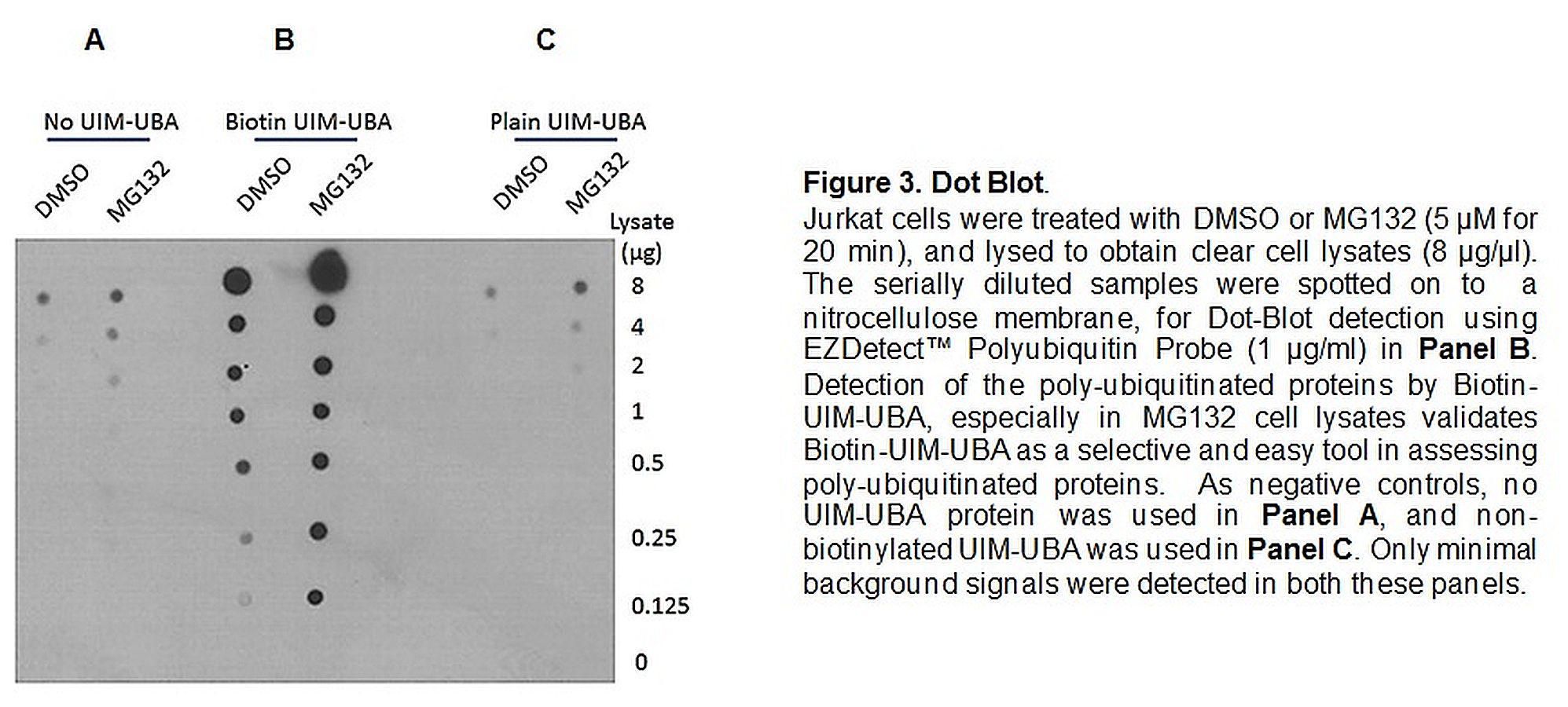Ezdetect Polyubiquitin Probe Biotin Conjugate 250ul^ Ezdetect Polyubiquitin Probe Biotin Conjugate, Probe to detect polyubiquitinated proteins by various techniques, (100 ug) of Biotin-UIM-UBA protein (0. 4 mg/ml) in PBS with 0. 1% Azide. Storage Conditions 4 deg C, Size: 250ul