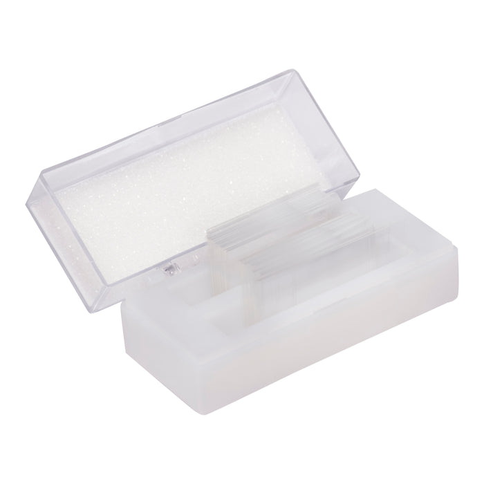 Rectangular Coverslip Cover Glasses measure 24x32mm with a thickness of 0.13-0.17mm. Manufactured from clear, pure white borosilicate glass for excellent clarity, flatness, and chemical resistance. They conform to ISO 8255 standard for dimensional tolerances, thickness, and optical properties, and are free of flaws and blisters. A pack of 100 coverslips comes in a plastic storage box with a hinged lid for protection.