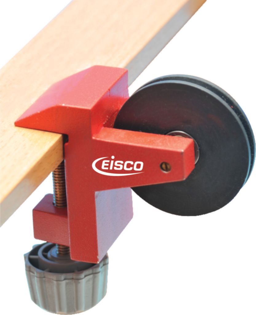 This clamp is made from high-quality metal and painted red. It features a high-quality plastic pulley, grey hand knob for tightening, and a 45mm plastic pulley with a bracket for bench mounting up to 25mm thickness. The clamp can also be used with a force table. Note: The wood in the picture is not included.