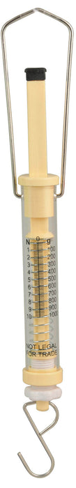 Acrylic transparent tubular body with a dual scale, calibrated in both grams and newtons. This allows for measurement in either mass (grams) or force (newtons). The capacity is 1 kg/10N, with subdivisions of 20g.
