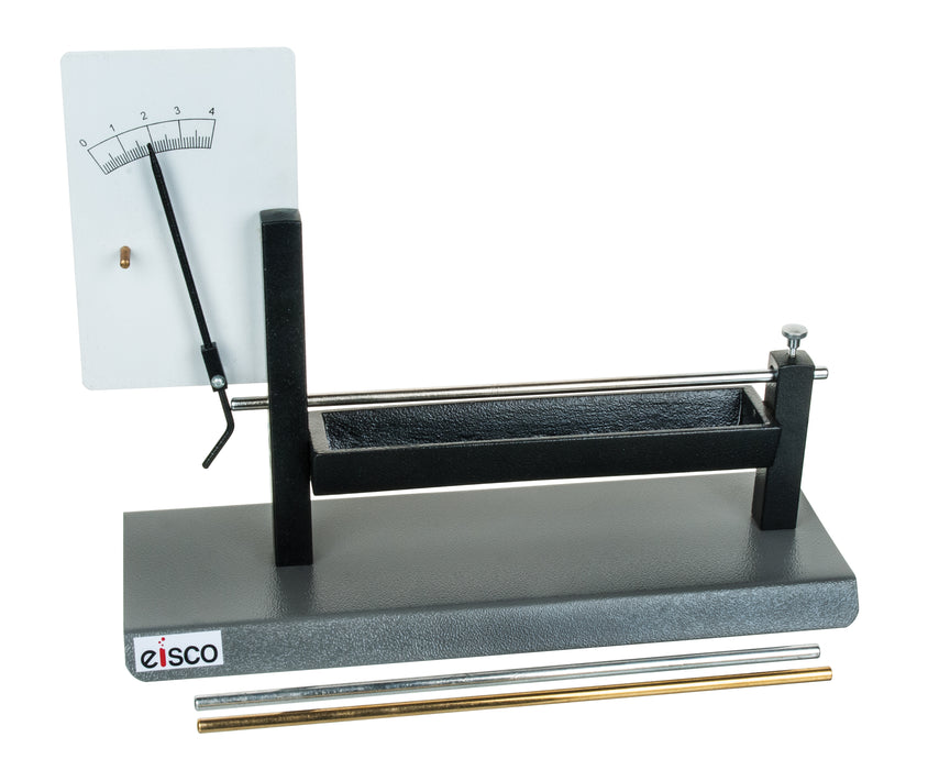This pyrometer apparatus is mounted on a metal base and features a large scale for easy viewing of expansion. It is used to demonstrate linear expansion through heating. The apparatus includes three expansion rods (aluminum, brass, and iron), each measuring 10 inches long and 0.25 inches in diameter. The overall dimensions of the apparatus are 12 inches in length, 5 inches in width, and 9.5 inches in height.