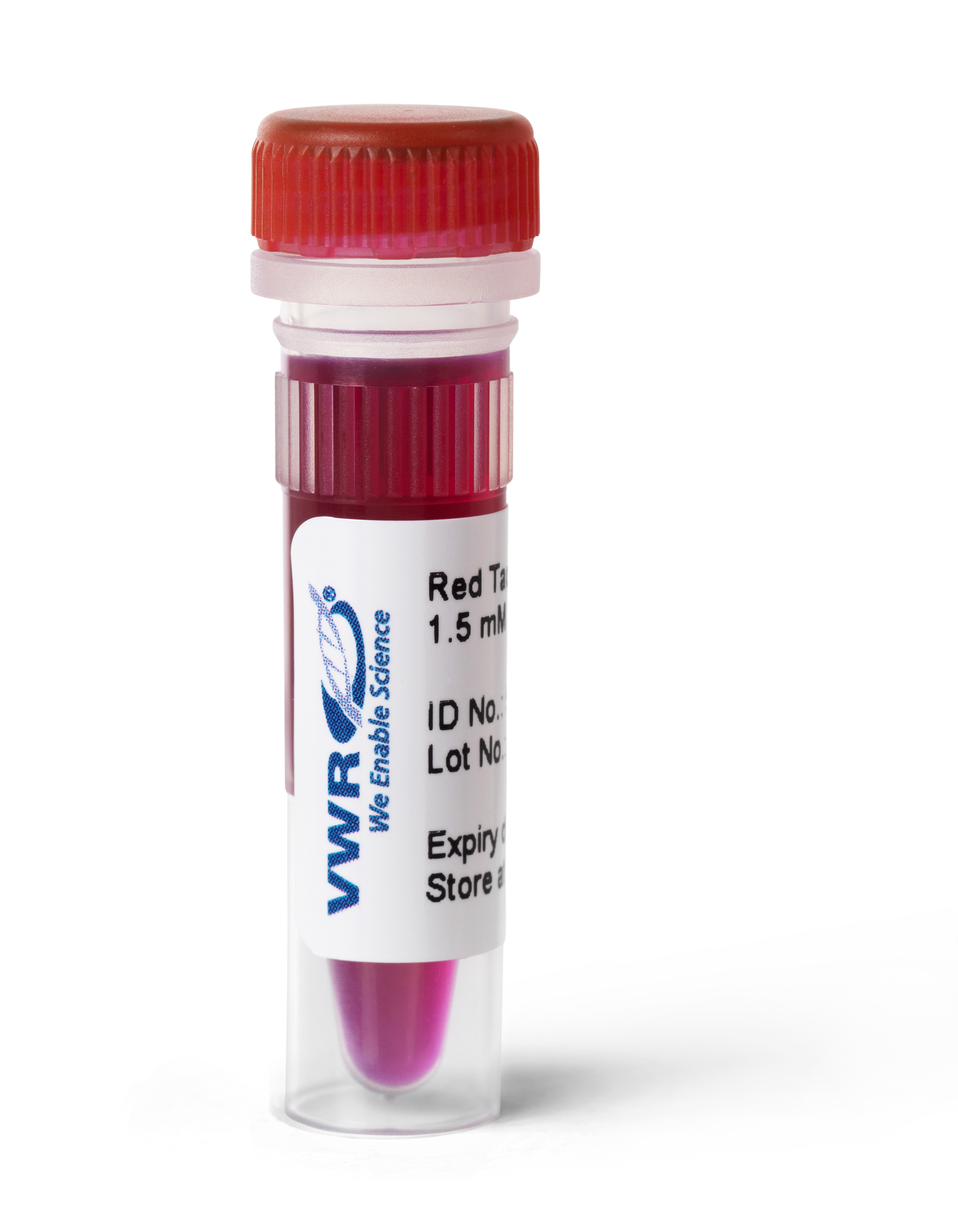 Concentration: 2X, VWR® Red Taq DNA Polymerase Master Mix, which also contains an inert red dye, can be directly loaded onto an agarose gel without addition of electrophoresis loading buffers., Red Taq DNA Polymerase master mixes are a good alternative to VWR® Taq DNA Polymerase. The inert red dye and stabilizer are extra features, which allow direct loading onto your agarose gel for analysis. The Red Taq DNA Polymerase master mixes offer reduced set-up time and eliminate the risk of contamination of reaction components. Fewer handling steps lead to better reproducibility, which makes master mixes suitable for standard PCR applications, screening and high-throughput testing. Red Taq DNA Polymerase Master Mix is a ready-to-use 1.1X or 2X reaction mix. Simply add primers, template, and water to carry out primer extensions and other molecular biology applications. Long term storage at -20 °C. Product expiry at -20 °C is stated on the label. Optional: Store at 4 °C for up to 6 months. VWR® Red Taq DNA Polymerase 1.1X and 2X master mixes are available in two final MgCl2 concentrations: 1.5 mM and 2 mM., 02_BulletPoint: All-in-one master mix for great convenience | Timesaving reaction setup | Direct loading onto agarose gel | Easy visualisation of pipetting | Red tracking dye | Increased reproducibility | High product yield | Processes up to 5 kb, 13_Caution: For Research Use Only. Not for use in diagnostic procedures., Red Taq DNA Polymerase 2X Master Mix (1.5 mM MgCl₂), Cat. No.: 76620-476, Units: EA, No. of reactions: 5000× 50 μl), Concentration: 2X, VWR® Red Taq DNA Polymerase Master Mix, which also contains an inert red dye, can be directly loaded onto an agarose gel without addition of electrophoresis loading buffers., Red Taq DNA Polymerase master mixes are a good alternative to VWR® Taq DNA Polymerase. The inert red dye and stabilizer are extra features, which allow direct loading onto your agarose gel for analysis. The Red Taq DNA Polymerase master mixes offer reduced set-up time and eliminate the risk of contamination of reaction components. Fewer handling steps lead to better reproducibility, which makes master mixes suitable for standard PCR applications, screening and high-throughput testing. Red Taq DNA Polymerase Master Mix is a ready-to-use 1.1X or 2X reaction mix. Simply add primers, template, and water to carry out primer extensions and other molecular biology applications. Long term storage at -20 °C. Product expiry at -20 °C is stated on the label. Optional: Store at 4 °C for up to 6 months. VWR® Red Taq DNA Polymerase 1.1X and 2X master mixes are available in two final MgCl2 concentrations: 1.5 mM and 2 mM., 02_BulletPoint: All-in-one master mix for great convenience | Timesaving reaction setup | Direct loading onto agarose gel | Easy visualisation of pipetting | Red tracking dye | Increased reproducibility | High product yield | Processes up to 5 kb, 13_Caution: For Research Use Only. Not for use in diagnostic procedures., Red Taq DNA Polymerase 2X Master Mix (1.5 mM MgCl₂), Cat. No.: 76620-480, Units: EA, No. of reactions: 20000× 50 μl, Concentration: 2X, VWR® Red Taq DNA Polymerase Master Mix, which also contains an inert red dye, can be directly loaded onto an agarose gel without addition of electrophoresis loading buffers., Red Taq DNA Polymerase master mixes are a good alternative to VWR® Taq DNA Polymerase. The inert red dye and stabilizer are extra features, which allow direct loading onto your agarose gel for analysis. The Red Taq DNA Polymerase master mixes offer reduced set-up time and eliminate the risk of contamination of reaction components. Fewer handling steps lead to better reproducibility, which makes master mixes suitable for standard PCR applications, screening and high-throughput testing. Red Taq DNA Polymerase Master Mix is a ready-to-use 1.1X or 2X reaction mix. Simply add primers, template, and water to carry out primer extensions and other molecular biology applications. Long term storage at -20 °C. Product expiry at -20 °C is stated on the label. Optional: Store at 4 °C for up to 6 months. VWR® Red Taq DNA Polymerase 1.1X and 2X master mixes are available in two final MgCl2 concentrations: 1.5 mM and 2 mM., 02_BulletPoint: All-in-one master mix for great convenience | Timesaving reaction setup | Direct loading onto agarose gel | Easy visualisation of pipetting | Red tracking dye | Increased reproducibility | High product yield | Processes up to 5 kb, 13_Caution: For Research Use Only. Not for use in diagnostic procedures., Red Taq DNA Polymerase 2X Master Mix (1.5 mM MgCl₂), Cat. No.: 76620-478, Units: EA, No. of reactions: 10000× 50 μl, VWR® Red Taq DNA Polymerase Master Mix, which also contains an inert red dye, can be directly loaded onto an agarose gel without addition of electrophoresis loading buffers., Red Taq DNA Polymerase master mixes are a good alternative to VWR® Taq DNA Polymerase. The inert red dye and stabilizer are extra features, which allow direct loading onto your agarose gel for analysis. The Red Taq DNA Polymerase master mixes offer reduced set-up time and eliminate the risk of contamination of reaction components. Fewer handling steps lead to better reproducibility, which makes master mixes suitable for standard PCR applications, screening and high-throughput testing. Red Taq DNA Polymerase Master Mix is a ready-to-use 1.1X or 2X reaction mix. Simply add primers, template, and water to carry out primer extensions and other molecular biology applications. Long term storage at -20 °C. Product expiry at -20 °C is stated on the label. Optional: Store at 4 °C for up to 6 months. VWR® Red Taq DNA Polymerase 1.1X and 2X master mixes are available in two final MgCl2 concentrations: 1.5 mM and 2 mM., 02_BulletPoint: All-in-one master mix for great convenience | Timesaving reaction setup | Direct loading onto agarose gel | Easy visualisation of pipetting | Red tracking dye | Increased reproducibility