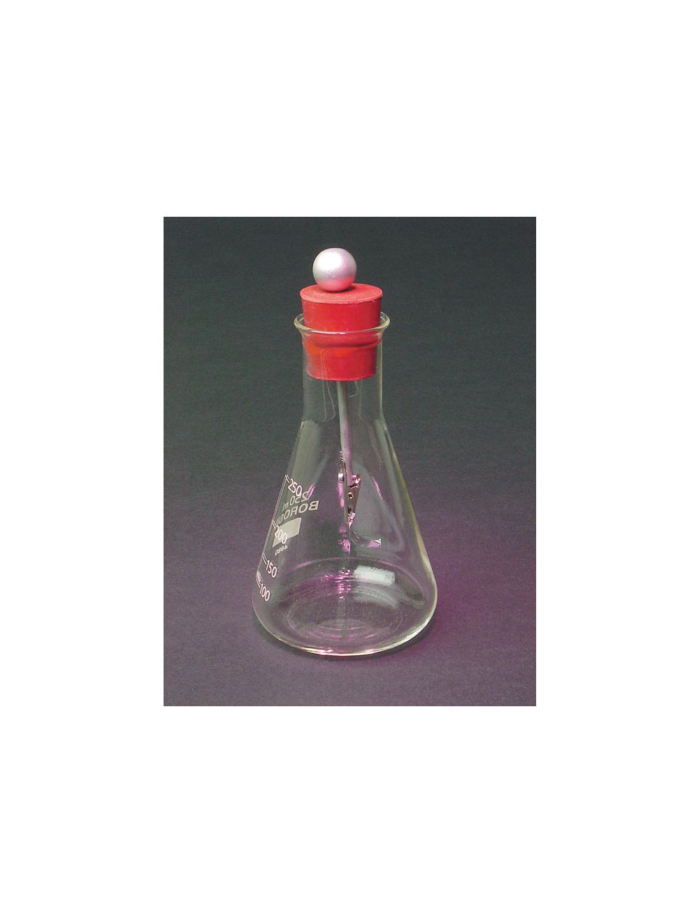 This electroscope is housed in a 250ml borosilicate flask with a metal rod attached to a rubber stopper. A pair of aluminum leaves is suspended from an alligator clip. The knob on top of the rubber stopper accepts a charge. When the charge enters the flask, the aluminum leaves separate. Also available are rod and alligator clip assembly for use with your own flask and replacement aluminum leaves. Includes activity guide.