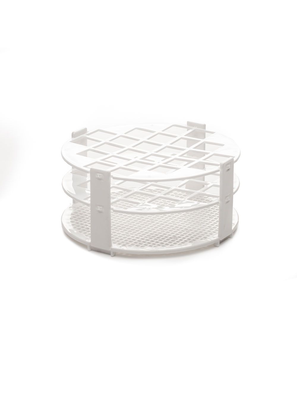 This high-quality round test tube rack holds 24 tubes with diameters of up to 20mm. Its solid construction is made from high-impact plastic. The rack measures 145mm in diameter and 70mm in height, featuring a perforated bottom. It is shipped pre-assembled.