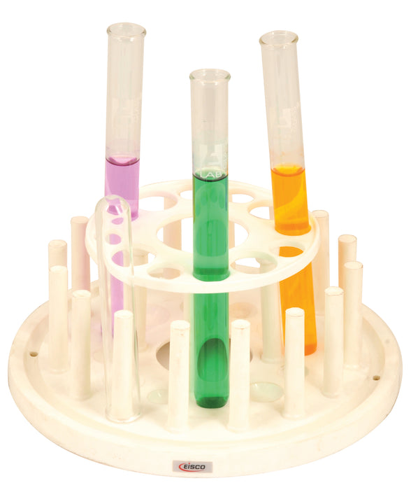 This product includes a polypropylene test tube stand that features a round design with 12 places. The top plate has four holes with a diameter of 25 mm and eight holes with a diameter of 19 mm, along with 16 vertical pins for drying tubes surrounded by a trough to catch drippings. This autoclavable rack can be easily disassembled for cleaning purposes.
