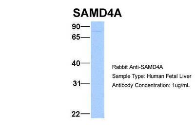SAMD4A Antibody^ Polyclonal, Host: Rabbit, Species Reactivity: Human, Mouse, rat, Immunogen: produced in rabbits immunized with a synthetic peptide corresponding a region of human SAMD4A, purified by peptide affinity chromatography method, Application: ELISA, western blot.