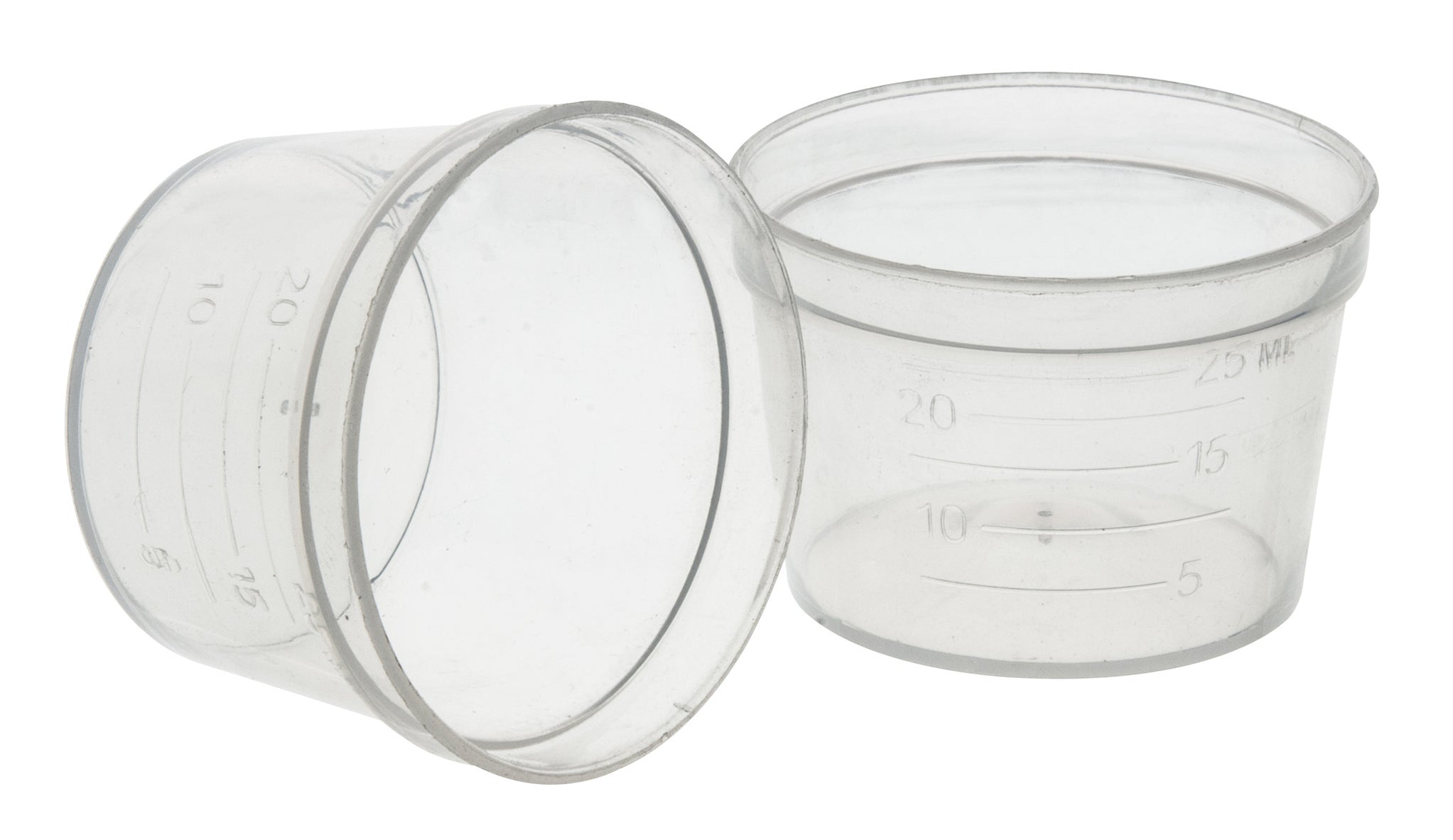 Transparent polypropylene cups can be used to measure various volumes of medicine for administration. With built-in graduations, measuring is made easy. Capacity: 25ml.
