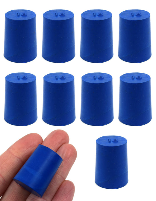 Pack of 10 stoppers made of solid neoprene rubber. Blue color. Each stopper measures 26mm in length, has a base diameter measuring 18mm, and a top diameter measuring 21mm. The neoprene rubber construction is suitable for use with petroleum products, minerals, oils and fats, as well as most inorganic acids and bases. Resistant to temperatures ranging from -40 to 130°C.