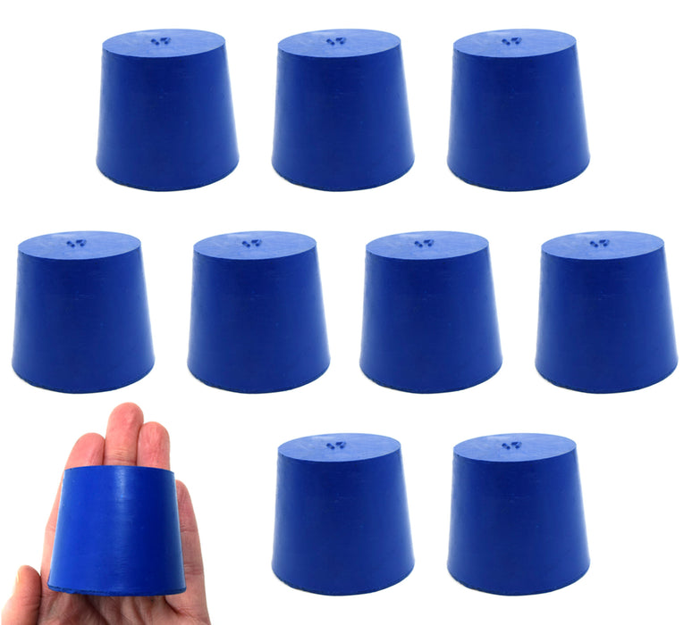 Pack of 10 stoppers made of solid neoprene rubber. Blue color. Each stopper measures 40mm in length, has a base diameter measuring 40mm, and a top diameter measuring 49mm. The neoprene rubber construction is suitable for use with petroleum products, minerals, oils and fats, as well as most inorganic acids and bases. Resistant to temperatures ranging from -40 to 130°C.