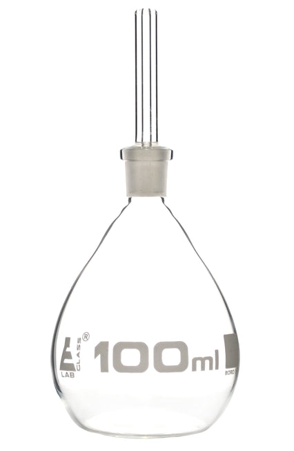 This specific gravity bottle is made of high-quality borosilicate 3.3 glass and has a capacity of 100ml. It features a perforated stopper and a flat bottom designed to prevent spills. The bottle measures 5 inches tall with the stopper and 3.5 inches tall without it, with a width of 2.25 inches.
