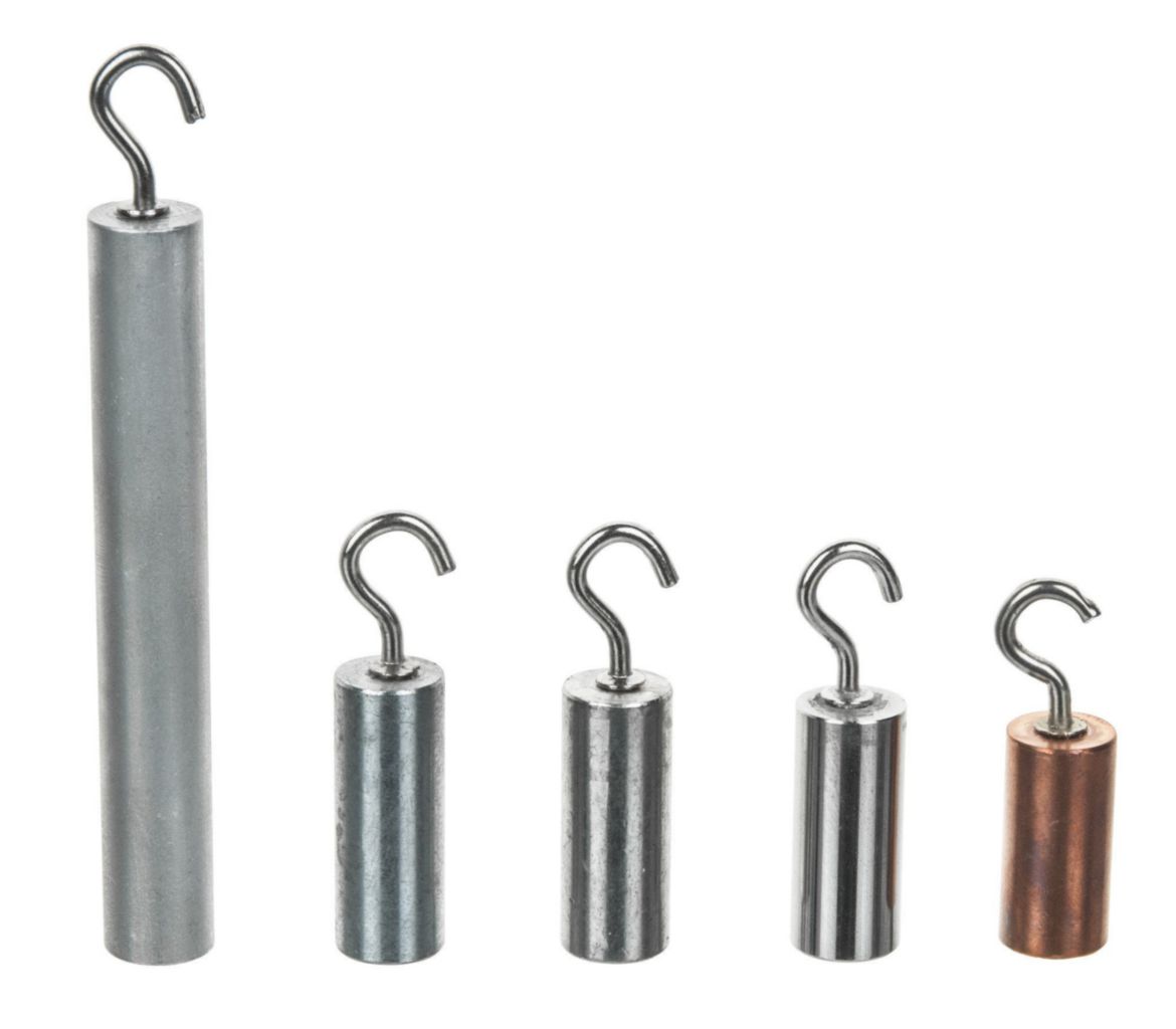 Here is the corrected text: This 5-piece set of metal cylinders features a top hook on each cylinder and includes Copper, Tin, Aluminum, Zinc, and Stainless Steel. Each cylinder has a uniform diameter of 0.5" (12.5mm) and a mass of 30g, but varies in length. The hooked design allows for easy lifting from boiling water and precise mass measurement using a spring scale (not included). This set is ideal for physics classrooms, offering a wide range of educational applications for all grade levels, including density investigations, specific heat exploration, and specific gravity analysis. The set includes a comprehensive instruction manual that provides background information on density, specific gravity, and specific heat, along with inquiry-based student activities and capture sheets. Please note that the raw metals may be subject to oxidation or corrosion due to humidity and storage; simply scuffing off any oxidation will restore their appearance. Designed for educational settings, these cylinders are not fabricated using ultra-high-precision machining, so expect tolerances within a +/- 5% range of stated dimensions (although they generally exceed this standard). The Eisco Labs Density Investigation series is designed to help students understand mass, volume, and density relationships, as well as specific heat and specific gravity concepts, providing quality introductory physics and chemistry lessons.