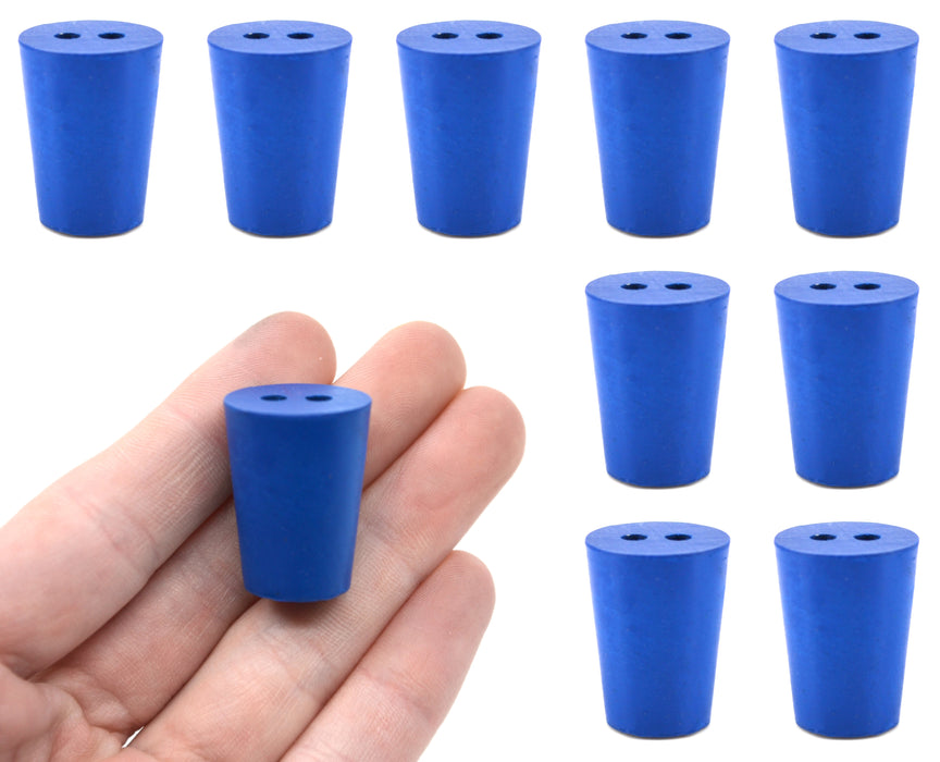 Here is the corrected text: This pack of ten #1 stoppers is made of long-lasting neoprene rubber in a blue color. Each stopper features two holes, measuring 5mm in diameter. Manufactured according to ASTM standard-recommended sizes, each stopper measures 25mm in length, with a base diameter of 14mm and a top diameter of 19mm. The neoprene rubber construction makes them suitable for use with petroleum products, minerals, oils, and fats, as well as most inorganic acids and bases. They are resistant to temperatures ranging from -40°C to 130°C.