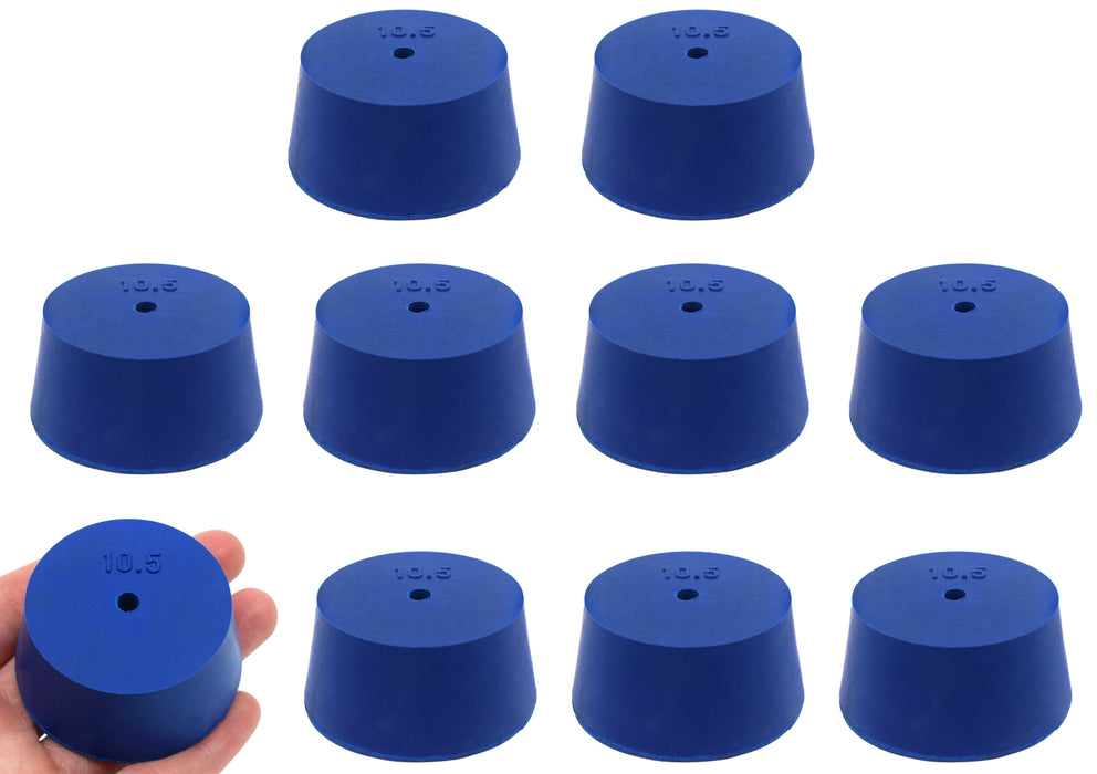This pack of ten #10.5 stoppers is made of long-lasting neoprene rubber and features a blue color. Each stopper has one hole measuring 5 mm in diameter. Manufactured according to sizes recommended by ASTM standards, each stopper measures 25 mm in length, with a base diameter of 45 mm and a top diameter of 53 mm. The neoprene rubber construction is suitable for use with petroleum products, minerals, oils, and fats, as well as most inorganic acids and bases. Additionally, it is resistant to temperatures ranging from -40°C to 130°C.