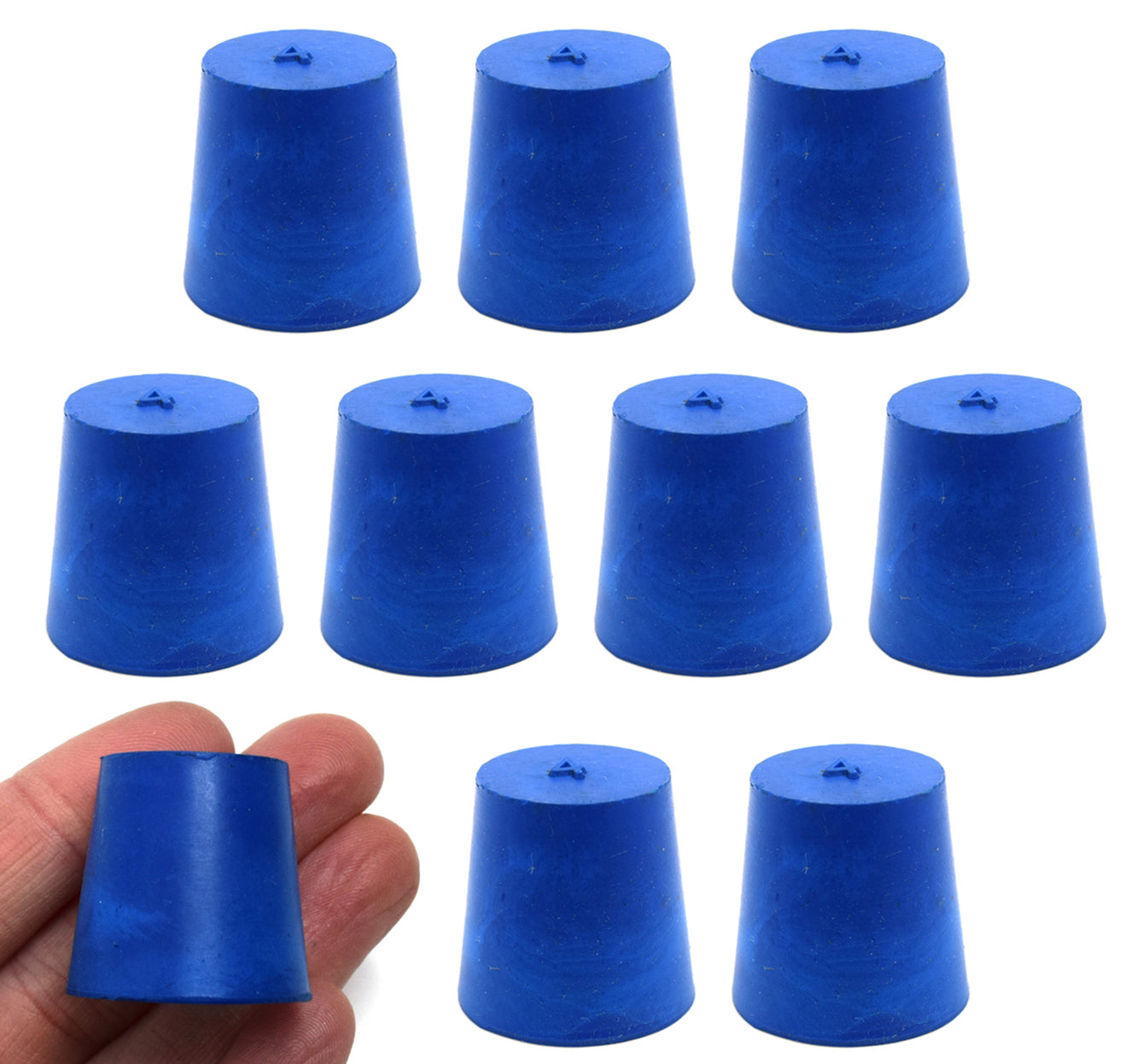 Here is the corrected text: This pack of ten #4 stoppers is made from solid, long-lasting neoprene rubber in a blue color. Manufactured according to ASTM standard-recommended sizes, each stopper measures 25mm in length, with a base diameter of 20mm and a top diameter of 26mm. The neoprene rubber construction makes it suitable for use with petroleum products, minerals, oils, and fats, as well as most inorganic acids and bases. It is resistant to temperatures ranging from -40°C to 130°C.