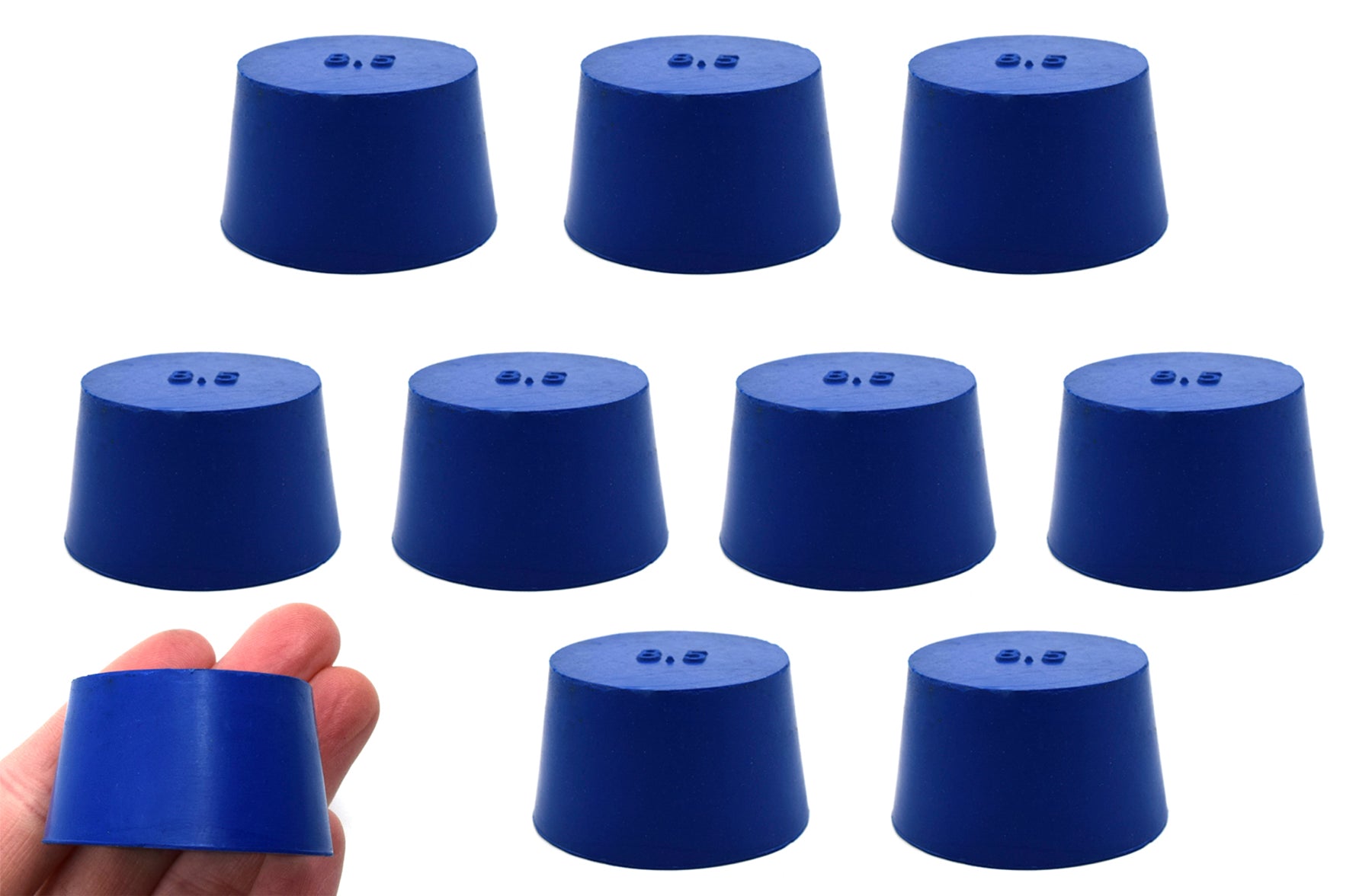 Pack of ten #8.5 stoppers made of solid, long-lasting neoprene rubber in blue color. Manufactured according to sizes recommended by ASTM standards, each stopper measures 25mm in length, with a base diameter of 36mm and a top diameter of 43mm. The neoprene rubber construction is suitable for use with petroleum products, minerals, oils, and fats, as well as most inorganic acids and bases, and is resistant to temperatures ranging from -40°C to 130°C.