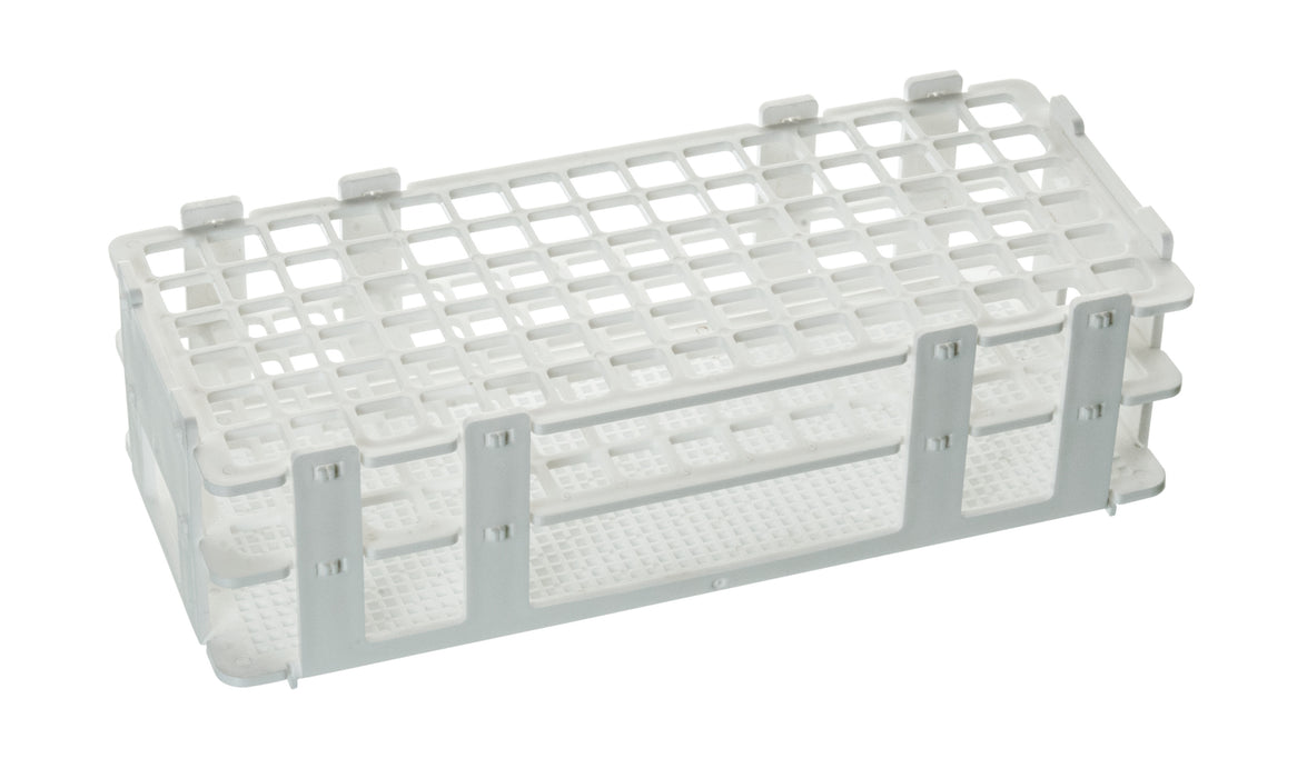 ull; Plastic test tube rack • Holds 90 test tubes up to 13mm • Autoclavable and durable • Easy disassembly for efficient and thorough cleaning • Stackable for economical storage This polypropylene test tube holder holds ninety (90) 13mm test tubes. It is comprised of 3 pieces and easy to disassemble for cleaning, stacking, and storage. It offers a high degree of economy in smaller lab settings where space counts and also handles well in classroom settings. Its economical pricing makes it a great option as well. Measures 9.75 x 4.75 x 2.5" when fully assembled.
