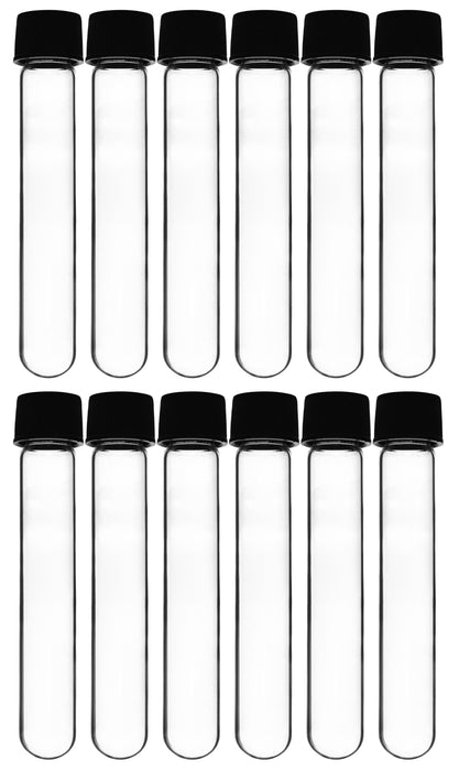 Here is the corrected text: Pack of twelve round-bottom culture tubes, each with a 30ml capacity. The tubes are made of high-quality Borosilicate 3.3 glass and include a Bakelite screw cap with a rubber liner for a leak-proof seal. These tubes are useful for various laboratory applications, including transferring and storing chemicals and samples, as well as handling and culturing biological material. They are also suitable for use in the home or garage for crafting and storage. The culture tubes are autoclavable and feature superior chemical durability, with a low temperature gradient that allows them to withstand high temperatures and thermal shocks. Each culture tube measures 1 inch wide and 3.9 inches tall (including cap). Designed for use in professional laboratories, they are an ideal choice for science classrooms and household use.