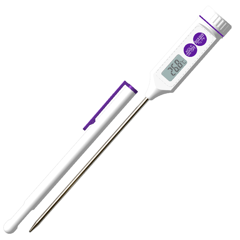 Here is the corrected text: This surface probe stem thermometer is ideal for cooking, laboratories, and hot plates. Its stainless-steel 120 mm (4.7") probe keeps your hand away from hot surfaces and can read temperatures in liquids, semi-solids, and gases. The thermometer includes accredited calibration documentation that meets the requirements of ISO 17025 and is individually serialized and CE marked. Please note that these electronic stem thermometers are not suitable for solids such as frozen items. The thermometer has been tested and calibrated in an exclusive triple-accredited/registered ISO/IEC 17025:2017, A2LA accredited laboratory (Cert #2448.01), against equipment whose calibration is traceable to NIST. It comes with multi-language instructions (English, French, German, Italian, Portuguese, and Spanish) and has a protection class of water-resistant IP 66. The thermometer features maximum/minimum data hold and has the following specifications: Temperature Accuracy: ±0.5 °C from –10...+100 °C; ±0.9 °F from 14...212 °F; otherwise ±1.5 °C...±2.7 °F, Temperature Resolution: 0.1 °C/°F, L×W: 205×22.5 mm (8.0×0.89"), Calibration Points: 0, 100 °C, Probe: 122 mm (4.8") stainless steel, Battery Type: CR1632, Cat. No.: 76472-450, Range: –50...200 °C (–58...+392 ˚F).