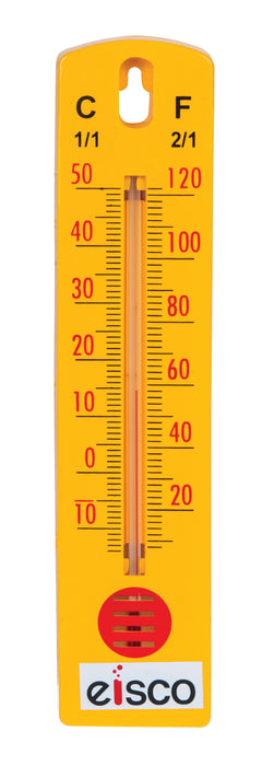 Simple plastic wall thermometer with Fahrenheit and Celsius readings. 8x2" dimensions.