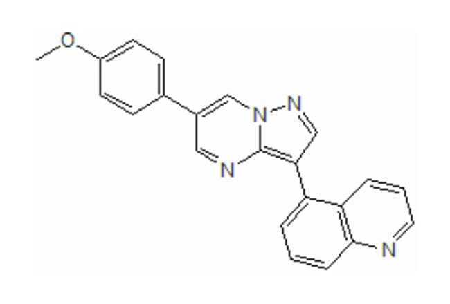 ML 347 is a potent and selective ALK2 and ALK1 inhibitor (IC50 values are 32 and 46 nM, respectively); displays >200 fold selectivity over ALK3 and ALK6 and >400 fold selectivity over VEGF2. Exhibits no activity at ALK4, ALK5 or in a panel of related kinases. Inhibits BMP4 signaling in a functional assay (IC50 = 152 nM).