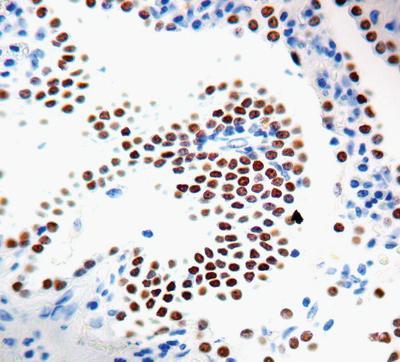 TTF-1^ Clone number 8G7G3/1, This antibody is specific to a 40 kD protein, which is identified as Thyroid transcription factor (TTF-1). TTF-1 is expressed in epithelial cells of the thyroid gland and lung. TTF-1 stains primary lung adenocarcinoma and small cell carcinoma but does not stain colon and breast carcinoma.