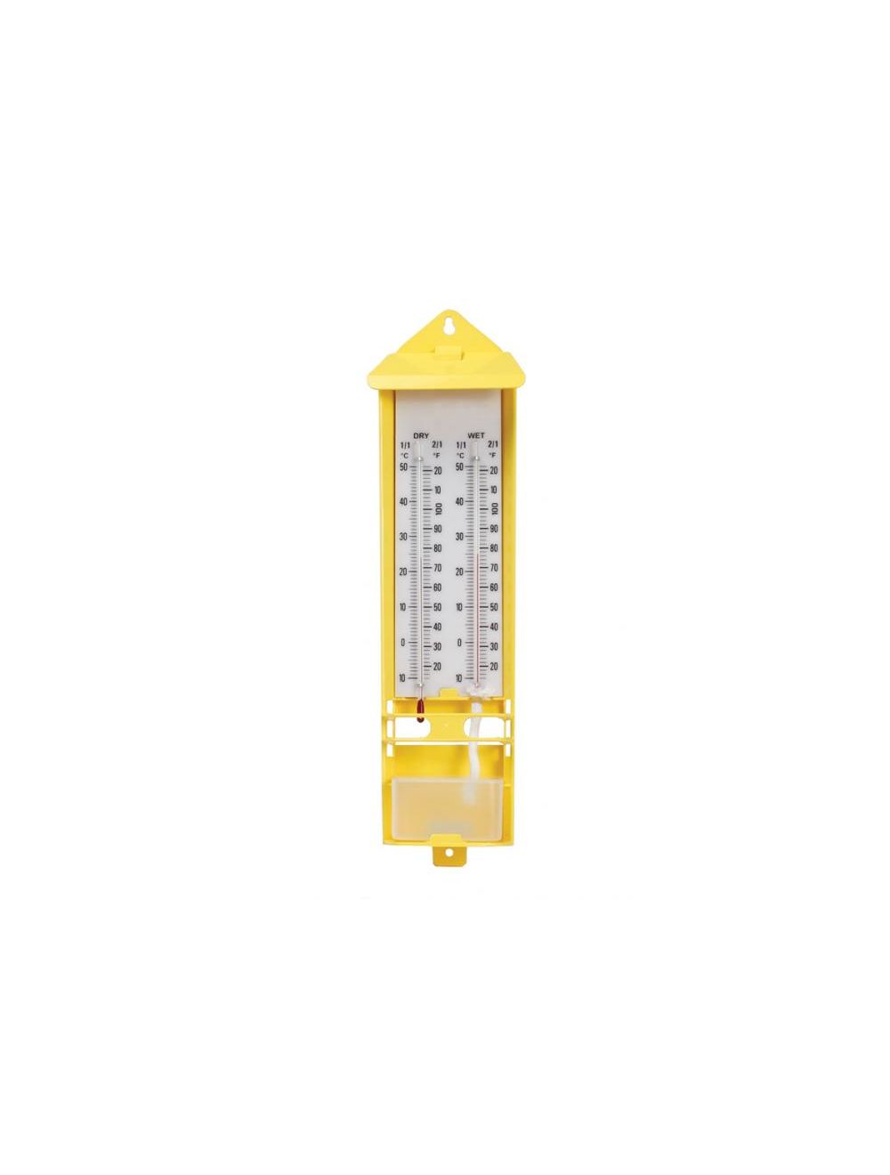 Calculate the relative humidity of air using this device. Includes two identical thermometers. The wet bulb thermometer has a wicking cloth material over the bulb and is connected to an included water reservoir. Thermometers are graduated in Celsius -10° to 50° (1°C) and Fahrenheit 14° to 122° (2°F). Includes humidity table in C. Dimensions: 11.5" x 3" x 1.75".