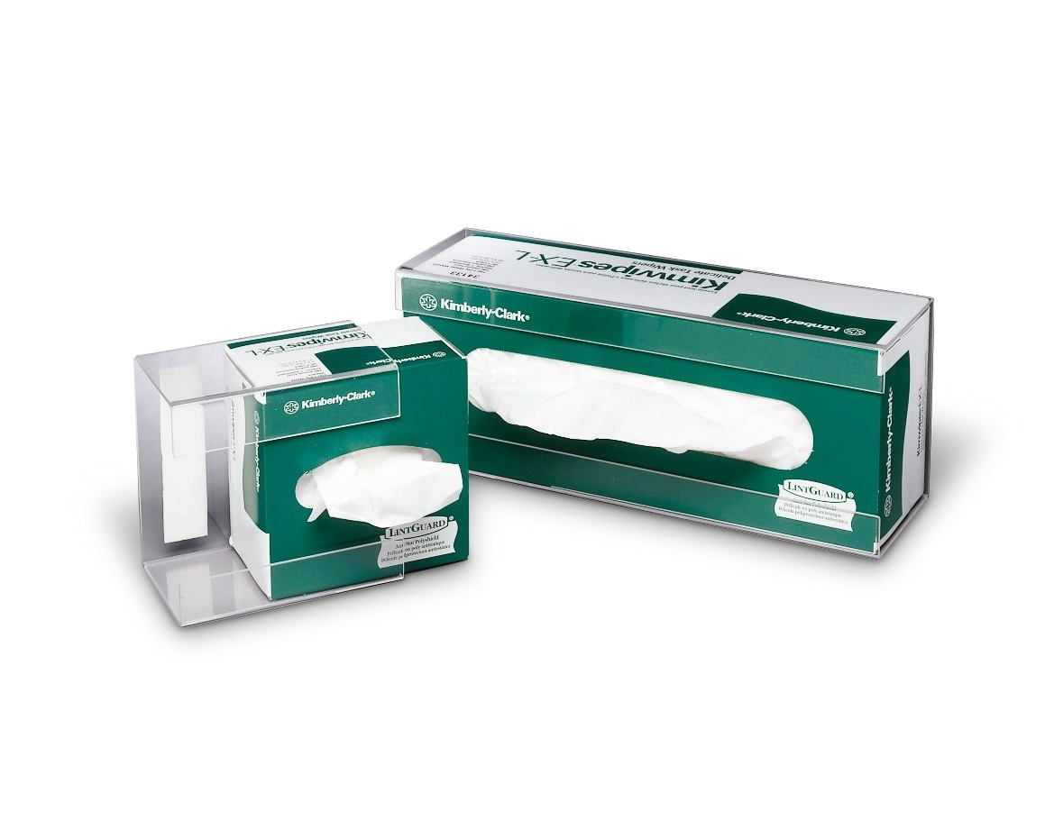 Here is the corrected text: Holds lab wipes from major brands, including Kimwipes. Clear acrylic holders fit boxes of small or large lab wipes. The smaller version attaches using double-stick tape, while the larger version uses screws. Mounts on a shelf or wall; mounting materials are included. Small Lab Wipe Holder: Dimensions - 118×122×84 mm, Cat. No.: 470311-038 Large Lab Wipe Holder: Dimensions - 320×127×97 mm, Cat. No.: 470311-040