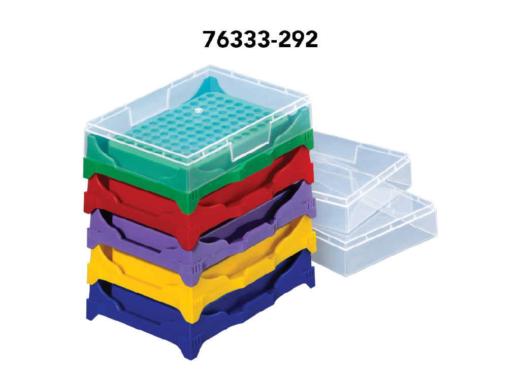 These racks accommodate 96-well PCR plates and either 8 or 12 strip tubes. The operating temperature range is -80 to 121°C (maximum). Features include a stackable design, a lid that locks into place, and a stable work platform. Each rack is supplied with one lid per unit. The standard colors available are blue, green, red, violet, and yellow. The dimensions of the rack are 138×98×39 mm. The catalog number for this product is 76333-292. This rack can hold either one 96-well plate, 90 tubes of 0.2 ml each, or 12 eight-strip tubes.