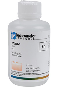 1000 ppm (µg/mL) Zinc for ICP is a 125mL certified reference material set in a nitric acid matrix for stability. This zinc standard is Traceable to NIST and manufactured in accordance with our stringent Quality Assurance guidelines. One year Expiration Date.